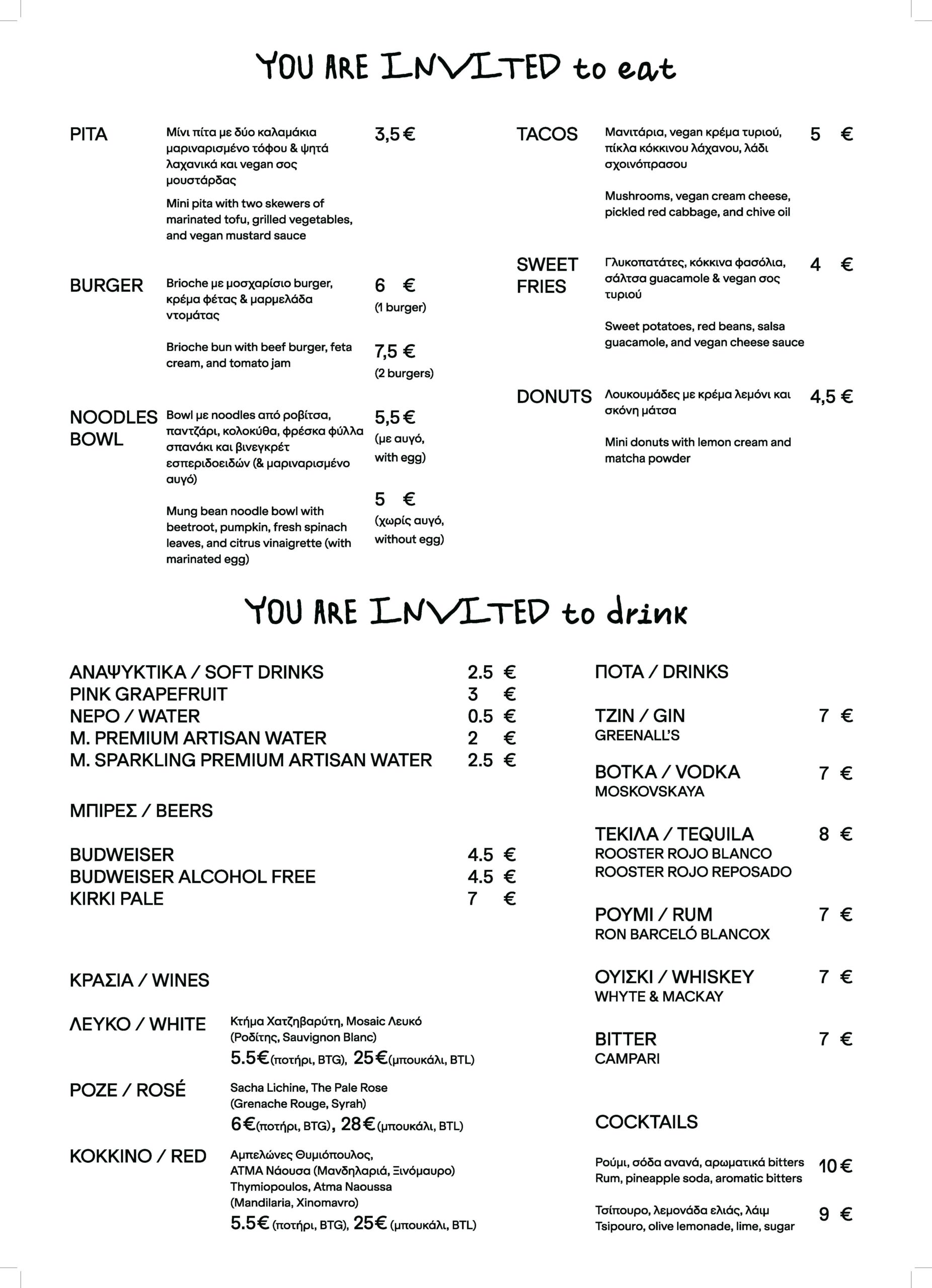 brioche burger με μπιφτέκι μοσχαρίσιο, φέτα cream και μαρμελάδα τομάτας, noodles bowl με παντζάρι, κολοκύθα, φρέσκο  σπανάκι και μαριναρισμένο αυγό, vegan bites με μανιτάρια, vegan τυρί κρέμα, κόκκινο λάχανο τουρσί και chive oil, γλυκοπατάτες με κόκκινα φασόλια, σάλτσα γουακαμόλε και vegan σως τυριού, και λουκουμάδες με κρέμα λεμόνι και σκόνη μάτσα.
